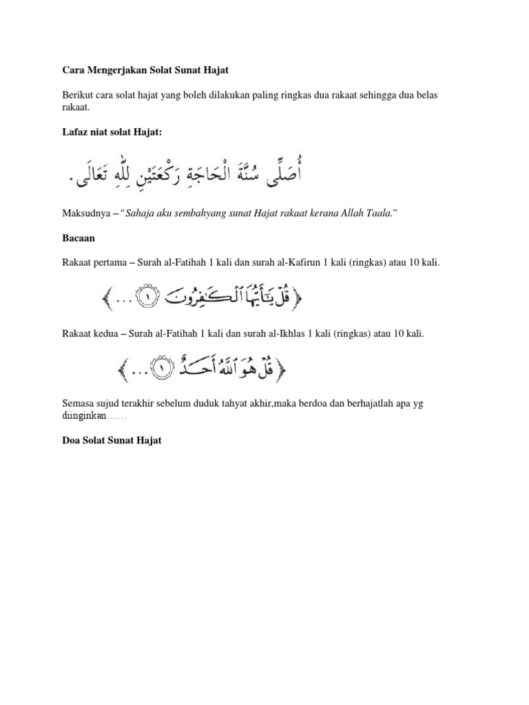 Cara Solat Sunat Hajat Ringkas from lh5.googleusercontent.com Untuk mengetahui bagaimana tata cara, niat, doa dan juga fadhilah sholat hajat, simak. Sebelum sholat disyaratkan suci dari hadats kecil dan hadats besar; Sholat hajat juga dilakukan sendiri dengan jumlah rakaat minimal 2 rakaat dan maksimal 12 rakaat. Nah berikut ini adalah tata cara, doa, serta waktu yang tepat untuk melaksanakan sholat hajat. Melaksanakan sholat hajat menjadi jawaban di tengah dinamika kehidupan umat manusia yang senantiasa diiringi perasaan ingin memiliki. Berikut tata cara sholat hajat yang dirangkum dari berbagai sumber. Sangat dianjurkan untuk siapa saja yang memiliki keinginan atau karena manfaat sholat hajat sendiri yaitu memenuhi hajat. Muhammad alvin nur choironi31 juli 2019.