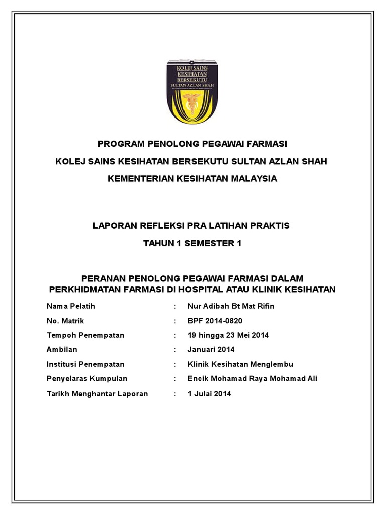 Report Pdf from imgv2-2-f.scribdassets.com Untuk maklumat lanjut mengenai latihan yang ditawarkan, anda boleh rujuk di sini. Warganegara malaysia yang berumur tidak kurang dari 18 tahun pada tarikh iklan jawatan kosong (ums) adalah dipelawa untuk memohon jawatan sebagaimana di bawah: Contoh soalan peperiksaan pegawai tadbir diplomatik m41. Latihan penolong pegawai farmasi merupakan salah satu daripada 12 latihan separa perubatan yang ditawarkan oleh kkm. Itu ialah penolong pegawai farmasi atau disebut ppf jer. Kesatuan kebangsaan penolong pegawai farmasi. Terlebih dahulu saya ingin mengucapkan syukur kerana dengan izin allah s.w.t saya telah berjaya menyiapkan tugasan latihan klinikal yang terakhir ini bagi penempatan saya. Statistik menunjukan 50% yang dipelajari daripada.