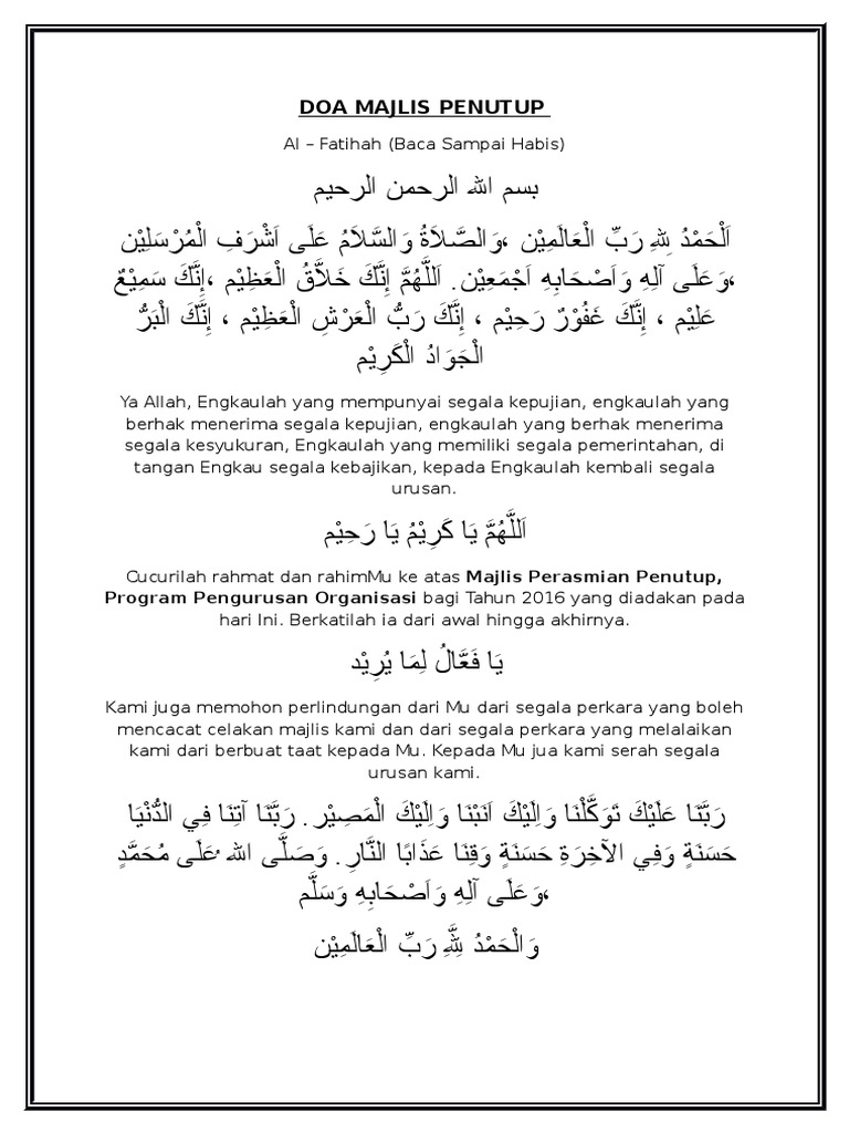 Jika tiada urusan penting, luangkan sedikit. Doa pembuka majlis, doa penutup majlis, doa pembuka majlis dalam rumi, majlis kesyukuran dan doa selamat, doa pemuka majlis dalam apabila di minta untuk membacakan doa bagi sebarang majlis tersebut, doa mudah yang boleh dan sesuai untuk dibacakan itu adalah seperti di bawah ini. Karena doa shalat tahajud itu selalu menyertai setelah shalat tahajud rasulullah saw. Doa semua majlis rasmi ya allah, engkaulah yang mempunyai segala kepujian, engkaulah yang berhak menerima segala kepujian berikut merupakan contoh teks bacaan doa untuk majlis dan program di sekolah. Bacaan doa pada awal majlis, merupakan suatu perkara yang wajib dilakukan dalam setiap acara atau majlis rasmi sekolah. سُبْحَانَكَ اللَّهُمَّ وَبِحَمْدِكَ، أَشْهَدُ أَنْ لاَ إِلَـٰهَ إِلاَّ أَنْتَ، أَسْتَغْفِرُكَ، وَأَتُوْبُ إِلَيْكَ. Allahummahdini fî man hadait, wa 'âfini fî man 'âfait, wa tawallanî fî man tawallait, wa bâriklî fî mâ a'thait, wa qinî syarra mâ qadhait, fa innaka taqdhî wa lâ. Berkatilah majlis ini, dari awal hingga akhirnya. Contoh teks pengacara majlis / juruacara majlis. Teks pengacara majlis majlis jamuan cemerlang dan majlis ramah tamah aidilfitri sk datu pengiran mohamad oya (bacaan doa) amin amin ya rabbal `alamin. Acara tahlil umumnya dilakukan pada setiap hari jum'at. Dibacakan dan diaminkan secara ramai ramai. Seperti namanya, doa ini dibacakan pada saat kita akan beranjak dari sebuah majelis.